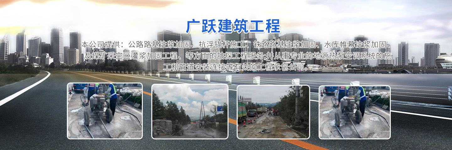 徐州廣躍建筑工程有限公司,公司成立于2010年,有專業(yè)施工人員50人,從事專業(yè)加固注漿施工。 本公司提供:公路路基注漿加固、抗浮錨桿施工、鐵路路基注漿加固、水庫帷幕注漿加固、及煤礦采空區(qū)灌漿加固工程、等方面的鉆探工程服務;并從事專業(yè)的地源熱泵空調(diào)系統(tǒng)的施工和管道安裝連接等有關(guān)的工程承包公司。 公司成立以來一直專注于地質(zhì)鉆井工作,技術(shù)力量雄厚、設備先進:擁有專業(yè)的機械地質(zhì)鉆井精英隊伍;并具有GSY --150鉆機30余臺、GSY---200鉆機20余臺、專業(yè)回填封孔砂漿泵4臺等機械設備。公司稟承“優(yōu)質(zhì)的工程、優(yōu)惠的價格、優(yōu)良的售后服務”的經(jīng)營理念,以“客戶滿意”為原則,著力打造一支高效、專業(yè)、信譽的工程服務團隊。 具體服務項目:工程施工降水井、水源空調(diào)井、地源熱泵井、機鉆深井(工廠專用井)、石頭井、飲用水井、農(nóng)田井、地基降水處理、大型基坑降水、地下室、車庫以及橋梁注漿加固等業(yè)務。可用于廠生產(chǎn)用水,機械冷卻用水和生活用水,用水量可根據(jù)貴公司的需求量身訂做。